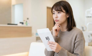 紹介状を手に、少し不安げに頬に手を添える日本人女性
