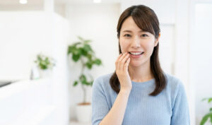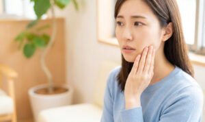 親知らず抜歯後、鏡を見ながら少し腫れた頬を気にする日本人女性の様子