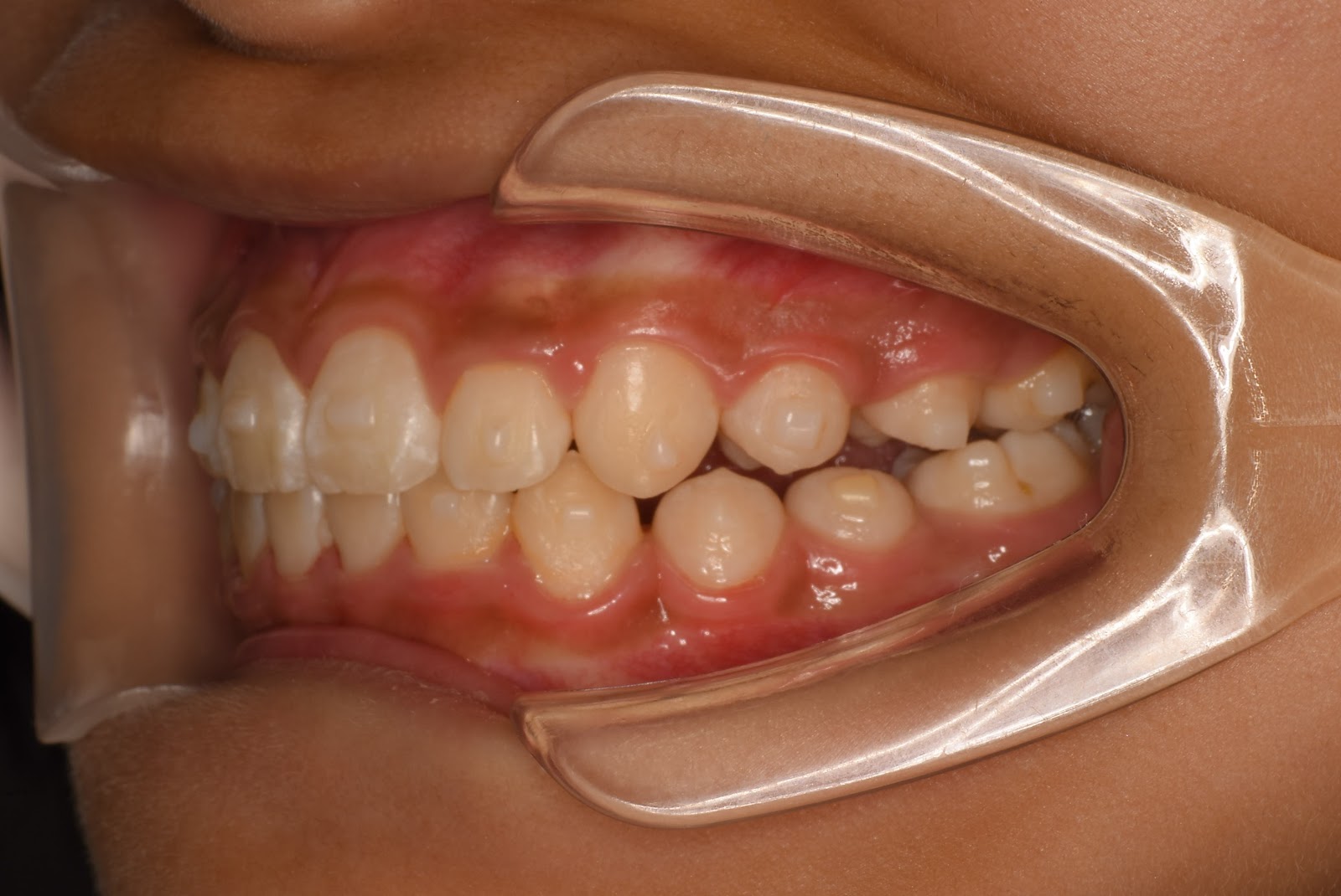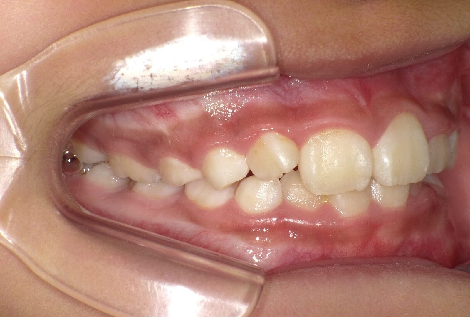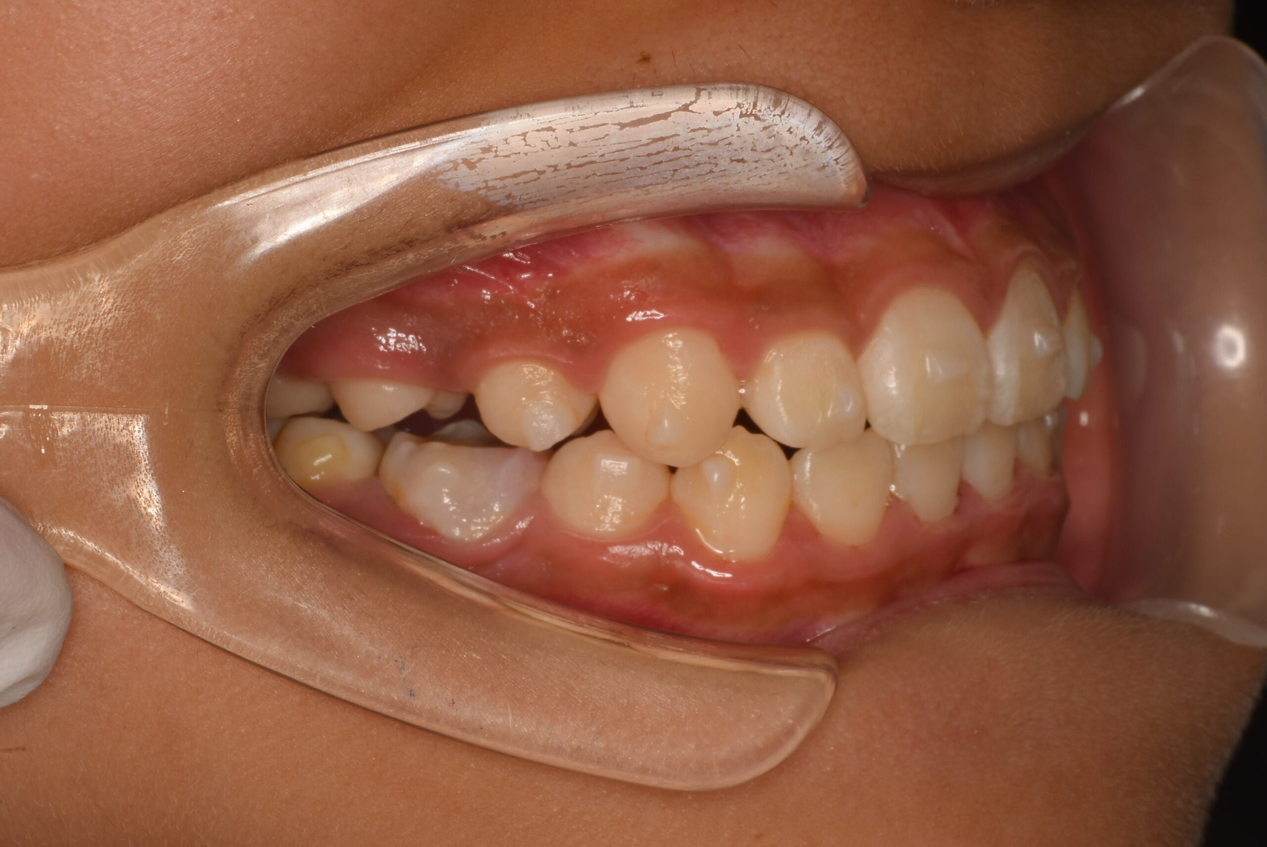 スペース不足と診断。永久歯の生え変わりの今に時期の開始がベスト。このまま放置すると、叢生になるケース。小児のマウスピース矯正で治療